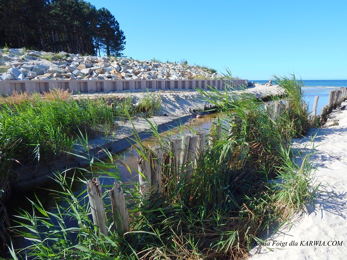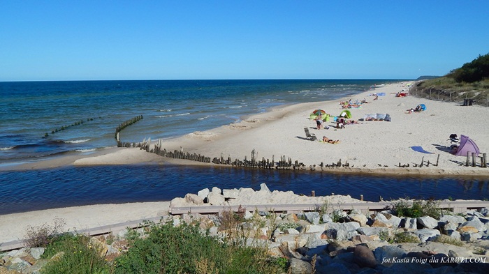 Wioska od morza oddzielona jest pasmem wydm porośniętych sosnowym lasem. Wyjść na plażę jest kilka, każde bardzo malownicze, wyglądają jak brama do słonecznego, morskiego świata :) Sama plaża jest bardzo szeroka, ma nawet 80 m, a piasek na niej to najlepszy piasek na polskim wybrzeżu. Jest złocisty i drobniutki, bardzo wygodnie się na nim leży, a zamki z niego zbudowane przez naszych milusińskich koniecznie trzeba uwiecznić na zdjęciu – takie są piękne! ;)